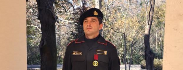 Tahiri shpërblen gardistinShpërblehet me medaljen “për Trimëri”, rritje me një gradë dhe një rrogë shtesë, gardisti, i cili gjatë procedurave të kontrollit zbuloi lëndën eksplozive në automjetin e prefektit të Vlorës. (Ne foto: Petrit Doka, gardisti)