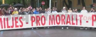 Stop perversitetitForumi Mysliman dhe Lidhja e Hoxhallarëve të Shqiptarëve protestuan sot para Galerisë së Arteve kundër homoseksualizmit. “Për fat të keq, mbas viteve 90 ka filluar një shthurrje e cila neve shpresojmë ta ndalojmë me kontributin e gjithë shoqërisë”, tha Fisnik Kruja, kryetar i Federatës së Myslimanëve.