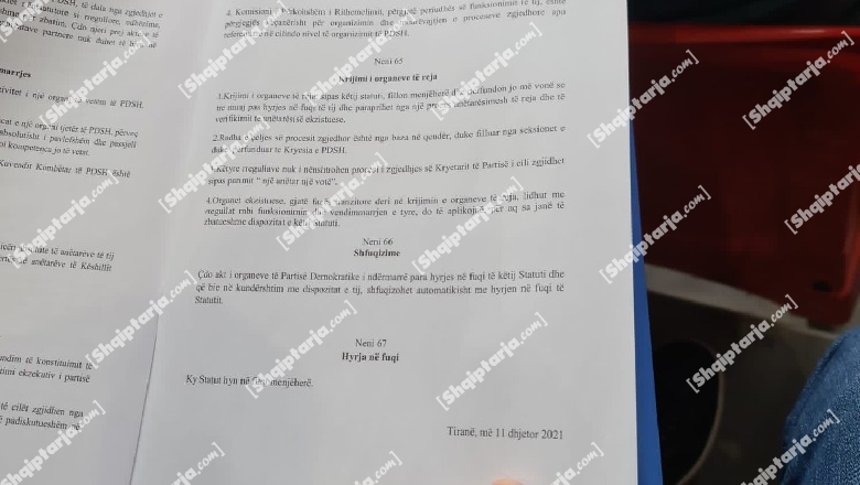11 Dhjetor 2021, 12:33Ndryshimet në Statut ia propozoi Kuvendit të thirrur nga Berisha, 4935 delegatëve por edhe militantëve të pranishëm, deputeti Oerd Bylykbashi. Statuti i ri i propozuar nga Sali Berisha u miratua me ngritje dore, duke e bërë të paqartë numërimin e votave se sa janë pro dhe sa janë kundër ndryshimeve.