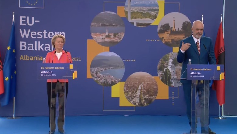 28 Shtator 2021, 07:19Ursula Von der Leyen erdhi së bashku me lajme shpresëdhënëse për një Shqipëri drejt familjes europiane, ku tha se Konferenca e Parë Ndërqeveritare mes BE dhe Shqipërisë pritet të mbahet brenda këtij viti. Presidentja e Komisionit Europian Ursula Von der Leyen e vlerësoi Shqipërinë për reformat, duke deklaruar se tani është koha që Bashkimi Europain të mbajë fjalën e të veprojë, pasi këtë gjë ia ka borxh rinisë shqiptare. Sa i përket nismës “Open Balkan”, Von der Leyen shprehu mbështetje të plotë, për sa kohë nuk del nga kornizat e procesit të Berlinit dhe siguron gjithpërfshirjen.