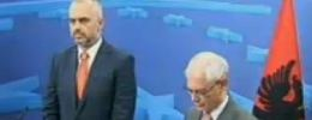 gjithnjë e më afër e më realistKryeministri Rama dhe Presidenti i Këshillit Europian Herman Van Rompuy (në foto) kanë dhënë një konferencë të përbashkët për shtyp. Rompuy theksoi se “statusi kandidat për Shqipërinë po vjen gjithnjë e më afër."