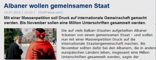 firma për "Shqipërinë Natyrale"“Shqiptarët duan shtet të përbashkët” (“Albaner wollen gemeinsamen Staat”). Me këtë titull ka qenë sot një shkrim në gazetën austriake, “Die Presse”, duke folur për problemin e shqiptarëve të copëtuar në Ballkan. Koço Danaj në “Die Presse”: Deri në nëntor, një milion nënshkrime dhe presion nëpër botë".