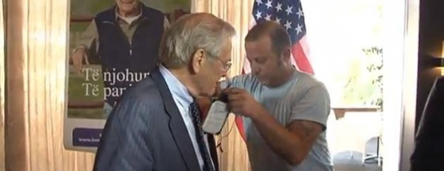 e tij pas intervistës për TV KlanIsh-sekretari amerikan i mbrojtjes Donald Rumsfeld, i cili erdhi në Shqipëri për të mbështetur në fushatë kryeministrin Sali Berisha është shqetësuar “seriozisht” për portofolin e tij. (Foto:Momenti kur operatori i tërheq portofolin nga xhaketa)