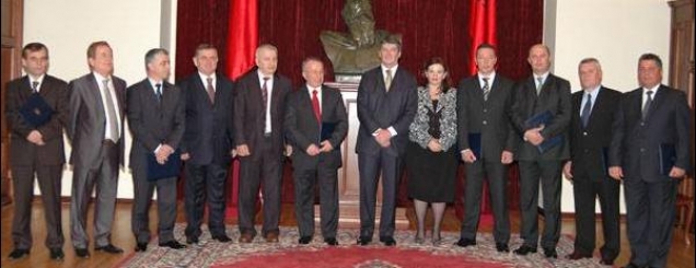 private: Rrisni kontrollin7 Marsi/ Duke folur në dekretimin e 10 rektorëve të rinj, kreu i shtetit ka pohuar se një situatë e tillë duhet të marrë fund në kushtet kur koston e cilësisë se ulet të studenteve, do ta vuajnë në të ardhmen qytetaret shqiptare. (Në foto: Presidenti Topi me 10 rektorët e universiteteve publike)