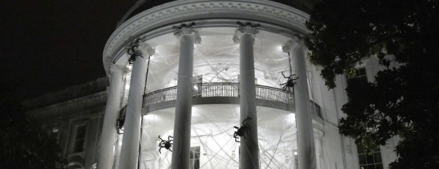 Shtëpia e Bardhë u transformua nga një ndërtesë madhështore në një spektakël të përhumbur për të festuar pragun e Halloween të hënën. Merimanga gjigande dhe rrjetat e tyre varen në muret si Shtëpisë së Bardhë, ndërkohë në oborr mund të shohësh kunguj të gdhendur me fytyrat e presidentëve të mëparshëm.