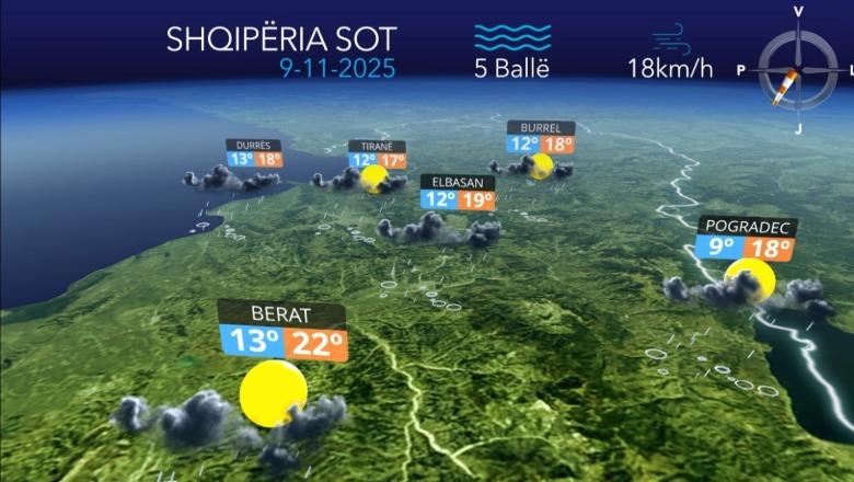 9 Nëntor, 06:44Moti parashikohet në pjesën e parë të ditës me kthjellime e alternime vranësirash mesatare dhe hera-herës deri të dendura.