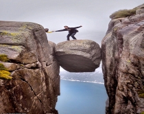 mes dy shkëmbinjve 243 m lartësiFotot e mëposhtme tregojnë një grup turistësh të guximshëm të qëndrojnë mbi një gur të ngecur në një të çarë mali prej afër 243 metrash lartësi rënieje.