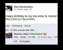 Përgjigjet shqiptari: “Faleminderit”Në një postim në faqen e saj në Facebook Kim Kardashian i ka uruar ditëlindjen motrës dhe mentores së saj, por përgjegjen për urimin ia ka kthyer një shqiptarme emrin Mentor.