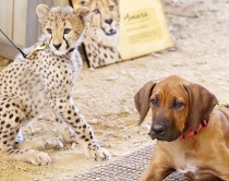 gatopardit dhe qenushitKëlyshi i gatopardit Ruxa dhe qenushja Raina, luajnë dhe vrapojnë sëbashku që kur u bashkuan për herë të parë para tre muajsh në kopshti zoologjik të San Diegos.