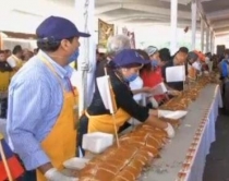 për sanduiçin me të gjatëQindra njerëz në Mexico City morën pjesë në thyerjen e rekordit të sanduiçit më të madh në botë, me një gjatësi prej 63 metrash e gjërësi prej 500 centimetrash, me peshë 650 kilogramë. Mega sanduiçi u realizua me ndihmën e më shumë se 80 bizneseve dhe shumë punonjësve të tyre, me qindra bukë të ndara dhe me përbërësit kryesorë të sanduiçit që banorët e Mexikos e quajnë “torta”.