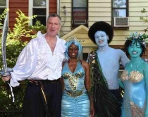 shumë-ngjyrëshe të Sirenës në New YorkI veshur si një pirat dhe me një shpatë që e vërtiste në duar , kryetari i Bashkisë Bill de Blasio marshoi bashkë me familjen e tij dhe shumë qytetarë të tjerë në Paradën e përvitshme të Sirenës së Ishullit Coney.