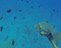 përqafon peshkaqenin nën ujëNë Bora Bora, një burrë duke notuar në Oqeanin Paqësor, ka përqafuar një peshkaqen nën ujë.