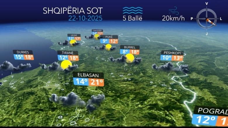 22 Tetor, 07:33Reshjet e shiut do të vijojnë të herëpashershme gjatë gjithë ditës me intensitet kryesisht të ulët, ndërsa lokalisht në zonën perëndimore e qendrore në pjesën e parë të ditës reshjet parashikohen me intensitet deri mesatar në formë shtrëngatash me shkarkesa elektrike.