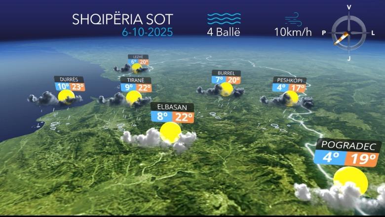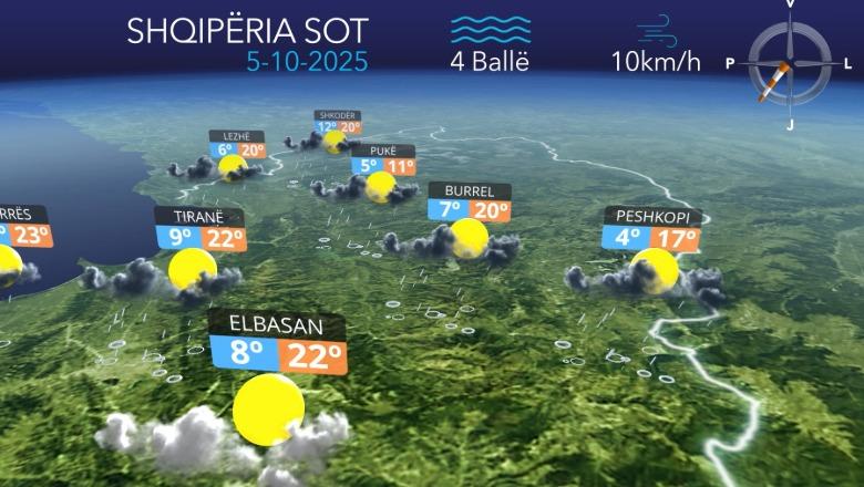 6 Tetor, 07:07Moti parashikohet i vranët shoqëruar me reshje shiu me intensitet të ulët në një pjesë të madhe të territorit, ndërsa përgjatë Ultësirës Perëndimore reshjet parashikohen me intensitet deri mesatar në formën e shtrëngatave shoqëruar me shkarkesa elektrike kryesisht në qarqet.