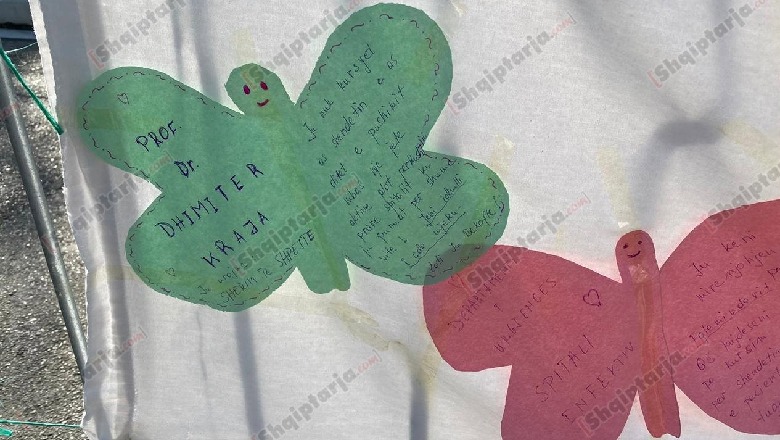 7 Prill 2020, 08:53Shënime vendosur ne disa letra shumë ngjyrëshe në formën e fluturave, ku mbajnë të shkruar emrat e mjekëve dhe dedikime e falënderime për ta.