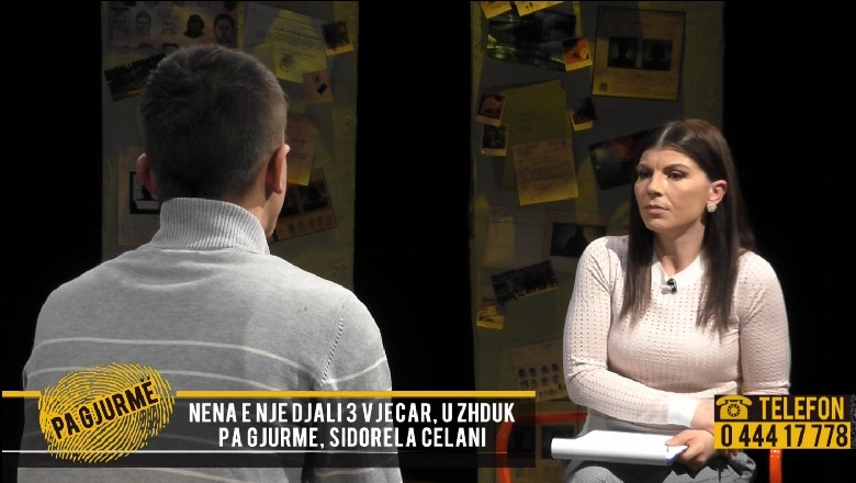 11 Shkurt 2019, 21:29Historia e një nëne të re 24-vjeçare ka ardhur e trajtuar, mbrëmjen e sotme në emisionin "Pa gjurmë". Prej 8 ditësh Sidorela Çelani, nënë e një fëmijë vetëm 3 vjeç, ajo ka humbur në mënyrë të mistershme çdo kontakt me familjen e saj, ndërsa sot vëllai dhe familja e kërkon për të ditur rreth fatit të saj,