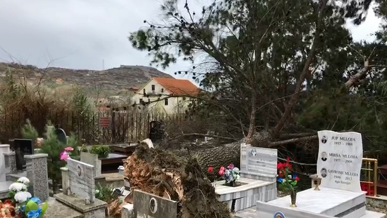 Era e fortë bënë 'kërdi' në Lezhë, pishat rrëzohen mbi varreza (VIDEO)
