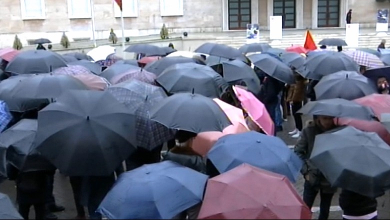 Nis grumbullimi/ Një grup studentësh sfidon shiun, me çadra në duar para Kryeministrisë (VIDEO)