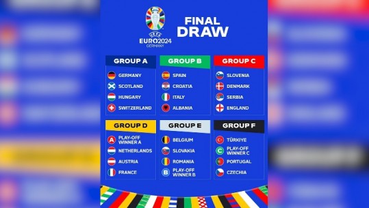 Kampionati Europian ‘Euro 2024’ do të nisë me përballjen Gjermani-Skoci në 14 qershor. Gjatë hedhjes së goglave, fati nuk ishte në krah të Shqipërisë, pasi mes 3 skuadrave që do të përballemi, janë edhe 2 ish-kampionë bote si Spanja, Italia si dhe Kroacia e cila ishte skuadra nënkampione në Kupën e Bot&e