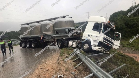 Aksident në dalje të tunelit në Elbasan, kamioni del nga rruga dhe përplaset me mbrojtjes metalike