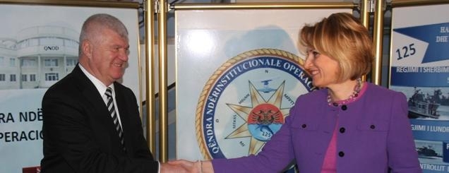 Gjeneral Majori, Maksim Malaj është prezantuar sot nga ministrja e Mbrojtjes Mimi Kodheli në detyrën e Drejtorit të Qendrës Ndërinstitucionale Operacionale Detare në Durrës. (Në foto: Ministrja Kodheli dhe Gjeneral Malaj)
