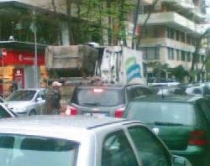 Makina e pastrimit të qytetit të Tiranës bllokon rrugën. Ndonëse si rregull pastrimi i kazanëve të plehrave bëhet vetëm natën, duket se këtë rregull firmat që kanë marrë përsipër të pastrojnë kryeqytetin nuk e zbatojnë.