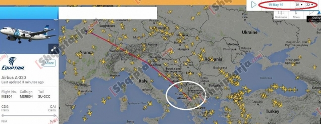 Avioni i nisur nga Parisi drejt Kairos në Egjipt ka fluturuar dhe mbi Shqipëri rreth 1 orë para se të zhdukej nga radari, Airbusi A320 ka flutuar mbi Shqipëri rreth orës 01:20 të mëngjësit të sotëm (19 Maj). VIDEO