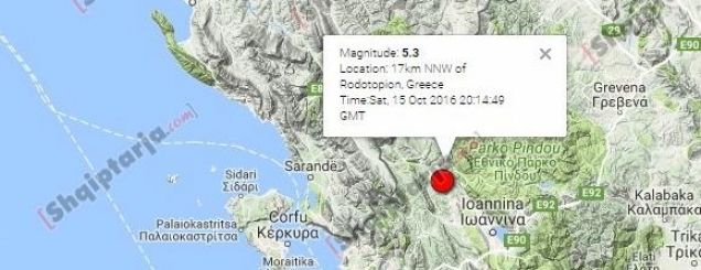 Një tërmet i fortë me magnitudë 5.3 të shkallës Rihter goditi rreth orës 22:15 të mbrëmjes së të shtunës, jugun e vendit.Lëkundjet janë ndjerë në Korçë, Gjirokastër, Vlorë si dhe Sarandë. Epiqendra e tërmetit prej 5.3 ballë, ka qenë në Greqinë Veriore, në afërsi të Janinës, ndërsa forca e tij është përhapur edhe në territorin shqiptar. VIDEOLëkundje tërmeti dhe pas mesnate në JugPrençi: Qytetarët në panik, por s'ka dëmeLëkundjet në Tiranë, Durrës, ElbasanSi mbrohemi nga tërmeti kur jemi në shtëpi