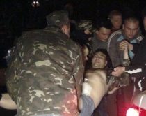 Tre persona u vranë gjatë një sulmi mbi një bazë ushtarake ukrainase në Mariupol. Rreth 300 separatistë pro-ruse sulmuan bazën ushtarake gjatë orëve të natës. Gjatë sulmit 3 prej tyre humbën jetën, 13 të tjerë u plagosën dhe 63 persona u arrestuan. (Në foto: një i plagosur gjatë sulmit në bazën ushtarake ukrainase në Mariupol)