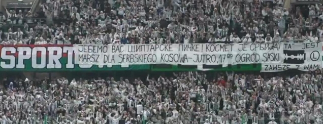 Në ndeshjen e futbollit të ligës polake, mes Legia Varszava dhe Korona Kielce, në tribunat e stadiumit të Varshavës është varur një parrullë, ndër më të poshtrat kundër shqiptarëve. (Në foto: Parrulla me thirrje antishqiptare në Varshavë)