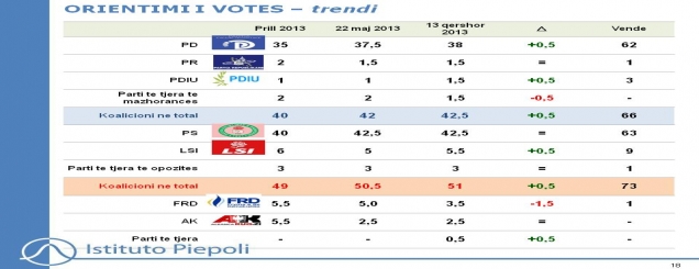 Nëse shqiptarët do të votonin sot, koalicioni i majtë do të fitonte zgjedhjet e 23 qershorit me një shumicë prej 51%, i pasuar nga koalicioni i djathtë me 42, 5 % të votave. Ky është përfundimi i sondazhit të tretë të institutit italian “Piepoli”.