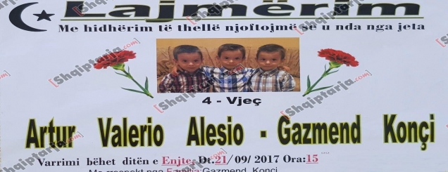 DURRES - Report Tv zbardh të tjera detaje nga ngjarja tragjike në fshatin Rromanat të Durrësit ku trenjakët e mitur humbën jetën si pasojë e zjarrit që ra në shtëpi. Artur, Alesio dhe Valerio Konçi ishin vetëm në banesë në momentin e ngjarjes, ndërsa tragjedia ndodhi vetëm pak çaste pas largimit nga shtëpia të mamasë të tyre, Migena Konçi e cila mbylli derën me çelës.