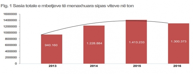Në vitin 2016 rezulton të jenë menaxhuar 1.3 milion tonë mbetje nga 1.4 milion tonë në vitin 2015, duke shënuar një rënie me rreth 8 pikë përqindje Sasia vjetore e mbetjeve të gjeneruara për banorë në shkallë vendi ka pasur luhatje të vazhdueshme, kjo shifër ishte 373 kg/banor në vitin 2016, 396 kg/banor në vitin 2015.