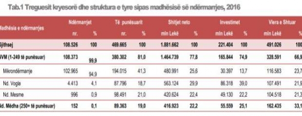 INSTAT ka publikuar statistikat për ndërmarrjet e vogla dhe të mesme për vitin 2016. Sipas statistikave punësimi në NVM ka shënuar një rënie me 0.3 %. Rreth 81,0 % e të punësuarve janë punësuar nga NVM nga 81,3 % që ishte në vitin e kaluar.