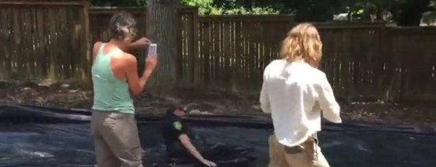 Një pistë me ujë e sapun dhe disa njerëz që po argëtoheshin duke lozur në të, ka shqetësuar disa persona aty afër të cilët kanë marrë në telefon policinë për të ndërprerë festën, pasi sipas tyre kishte bllokuar edhe rrugën.