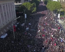 Përvëç fjalimeve, pankartave dhe mesazheve të ndryshme nuk ka munguar edhe një protestues me veshje të veçantë. Protestuesi ka veshur një kostum të sportive të bardhë dhe ka shkruar me kolor të zi “Vllazënia dhe demokracia të mbyturata shpëtojmë”.