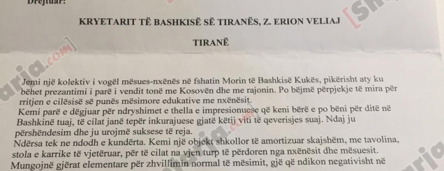 Veliaj ka marrë një letër të pazakontë nga kolektivi i mësuesve dhe nxënësve të fshatit Morinë të Bashkisë Kukës. Pasi ata vlerësojnë punën që kryebashkiaku ka bërë në Tiranë, shpjegojnë situatën e mjeruar në të cilën ndodhet shkolla në të cilën presupozohet të jepet dhe merret dija. Të gjitha përpjekjet e këtyre njerëzve për të pasur një shkollë më të denjë nuk kanë marrë përgjigjen e merituar, ndaj ata i luten Veliajt t’i marrë nën juridiksionin e tij.