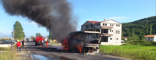 SHKODER/ Një autobus që vinte nga Kosova është përfshirë nga flakët pasditen e sotme në afërsi të Kryebushatit në Shkodër. Mesohet se autobusi fillimisht është përplasur me 2 automjete të tjera dhe më pas ka pësuar avari që ka shkaktuar zjarrin.FOTO VIDEO