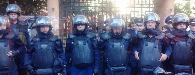 Përplasje fizike tek selia e PSD, mes përmbaruesve dhe policisë private. Gjinushi: Janë një bandë hajdutësh. Përmbaruesit u futën brenda selisë dhe hapën ambientet dhe nxorrën jashtë mobilje. Rreth orës 09:45 minuta të mëgjesit mbërritën edhe forcat e policisë të Komisariatit numër 3. (Në foto: Policia dhe forcat e policisë tek selia e PSD) Përplasja e Policisë së Shtetit dhe asaj private tek selia e PSD/ 29 Tetor 2013