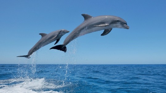 Pushuesit në plazhin e Akërnisë në Vlorë janë mrekulluar nga kjo pamje, por megjithatë nuk kanë lënë pas aspektin human, duke i ndihmuar delfinë të largohen nga cekëtina.