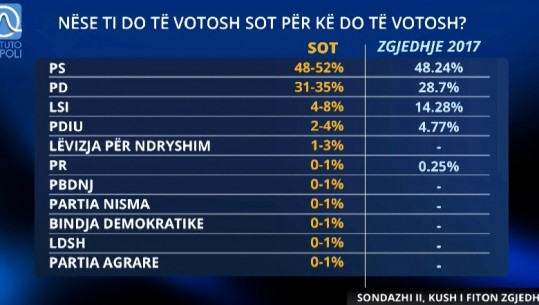 Report Tv dhe Instituti prestigjioz italian Piepoli publikuan sondazhin e dytë për zgjedhjet politike të 25 prillit. Partia socialiste mbetet forca kryesues dhe ka një distance të madhe me PD dhe LSI edhe nëse ato i bashkojnë votat. Ndërkohë që surprizë është partia e Topallit, e cila garon për të marrë 1 mandat. Në Tiranë sond