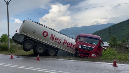 Elbasan/ Përmbyset autoboti në mes të rrugës, shpëton mrekullisht shoferi