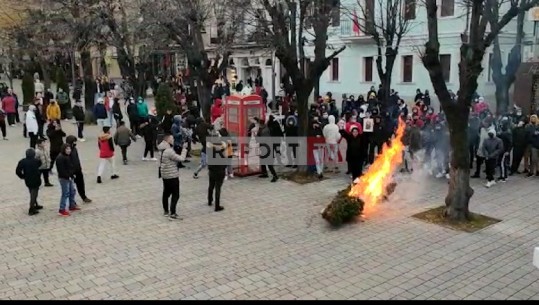 Protestuesit në Korçë thyejnë xhama e i vendosin flakën zbukurimeve! Policia, shpërndan protestën