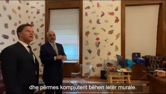 'Oh, kjo është zyra jote', kryeministri holandez mahnitet si Rama i kthen vizatimet në letër murale: Vazhdo kështu, je i veçantë