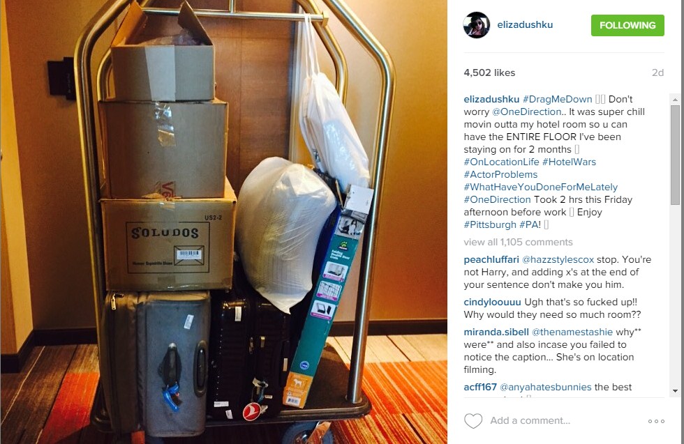 Këtë ndodhi e ka bërë publike vetë Dushku përmes një fotoje dhe një shkrimi në Instagram ”#DragMeDown (më tërhiq poshtë), One Direction mos u shqetsoni, ishte aq mirë të dilja jashtë dhomes time te hotelit saqë mund ta mbani te gjithë katin për vete, aty ku unë kam qëndruar për dy muaj”.