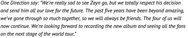 Malik me keqardhje i ka komunikuar fansave të tij vendimin që ka marrë duke u shprehur se nuk kishte qenë aspak e lehtë për të, por po kalon një fazë kritike dhe ka nevojë të jetojë si një 22-vjecar normal, pa qenë gjithnjë në qendër të vëmendjes. “Kam 4 miq të mirë; Louis, Liam, Harry dhe Niall. E di që ata do vazhdojnë të jenë më të mirët”,- shprehu këngëtari mbështetjen për miqtë dhe kolegët e tij.