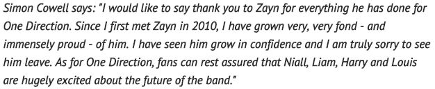 Lidhur me këtë situatë reagoi dhe Simon Cowell, producenti i talent show ‘X Factor’, nga ku edhe u krijua grupi simpatik ‘One Direction’. “Do doja ta falënderoja Zayn për gjithçka që ka bërë për grupin,- u shpreh ai,- qëkur e takova për herë të parë në 2010, kam qenë gjithnjë e më shumë krenar për të. E kam parë teksa rritet dhe më vjen keq ta shoh teksa largohet. Sa për fansat e ‘One Direction’, mund t’i siguroj fansat që pjesëtarët e tjerë të grupit janë shumë të emocionuar për të ardhmen e bandës”.