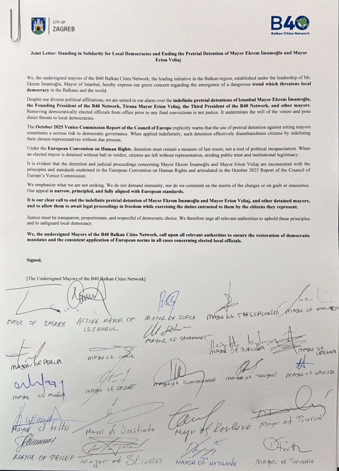 Pavarësisht përkatësive tona të ndryshme politike, ne jemi të bashkuar në ngritjen e alarmit për paraburgimin pa afat të Kryetarit të Bashkisë së Stambollit, Ekrem İmamoğlu, President themelues i Rrjetit B40, Kryetarit të Bashkisë së Tiranës, Erion Veliaj, Presidenti i tretë i Rrjetit B40, si edhe të kryetarëve të tjerë. Largimi nga detyra i zyrtarëve të zgjedhur në mënyrë demokratike, pa një vendim përfundimtar, nuk është drejtësi. Ai minon vullnetin e votuesve dhe paraqet kërcënime të drejtpërdrejta për demokracitë vendore.