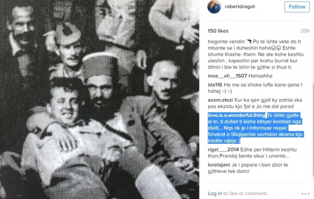 Robert Aliaj i mbiquajtur, Robert Dragoti, këngëtar dhe personazh kontravers publikon një foto të ish-diktatorit Enver Hoxha me një përshkrim. Duke e etiketuar si homoseksual dhe shpjeguar pozicionin e tij në prehrin e një burri, Robert Aliaj thotë se Enver Hoxha ka qenë pararendësi i lëvizjeve LGBT.