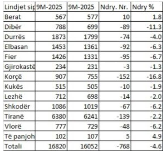 Nga ana tjetër, Korça ka shënuar rënien më të fortë të lindjeve në vend, me -16.8% në nëntëmujorin e 2025. Ky rezultat lidhet me emigrimin e vazhdueshëm të të rinjve dhe me moshimin e popullsisë, çka ka sjellë një ulje strukturore të lindshmërisë.